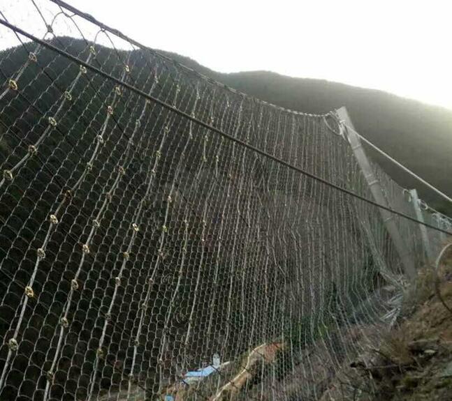主動防護系統是以鋼絲繩網為主的各類柔性網覆蓋包裹在所需防護斜坡或巖石上,以限制坡面巖石土體的風化剝落或破壞以及為巖崩塌(加固作用),或將落石控制于一定范圍內運動(圍護作用)
